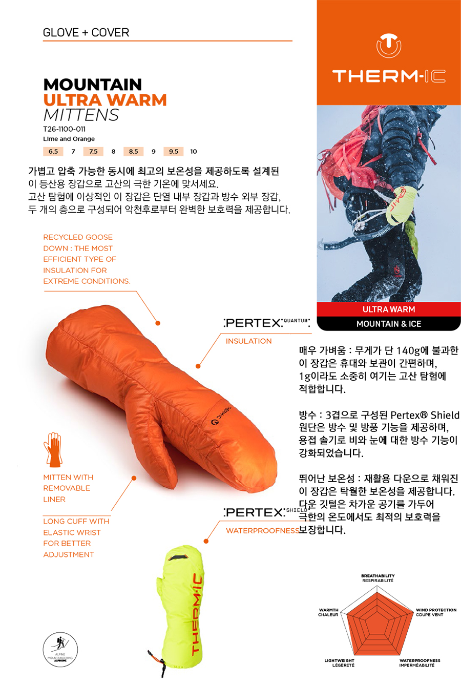 소재 : 단열재로 재활용 다운, 오버 미트로 3겹 Pertex® Shield 사용.